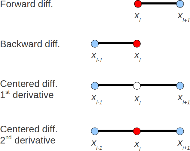 \[ \begin{aligned} f''(x) &= \frac{f(x+h) - 2f(x) + f(x-h)}{h^2} - \frac{f^{(4)}(x)}{12}h^2 + \cdots\\ &\approx \htmlClass{color1}{ \frac{f(x+h) -2f(x) + f(x-h)}{h^2}}\end{aligned} \]